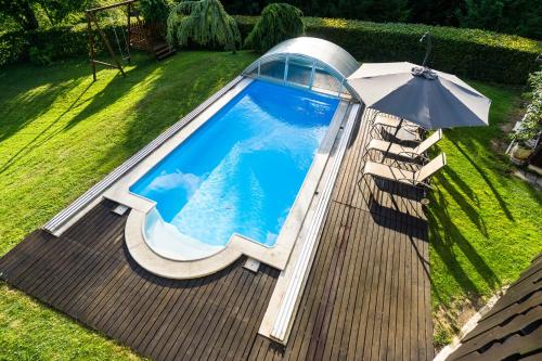 Die Unterkunft Holiday House in Nature with Pool, Pr Matažič besticht durch Bergblick und Übernachtungsmöglichkeiten mit einem Balkon und einer Kaffeemaschine, ungefähr 27 km von Hauptbahnhof Ljubljana entfernt.